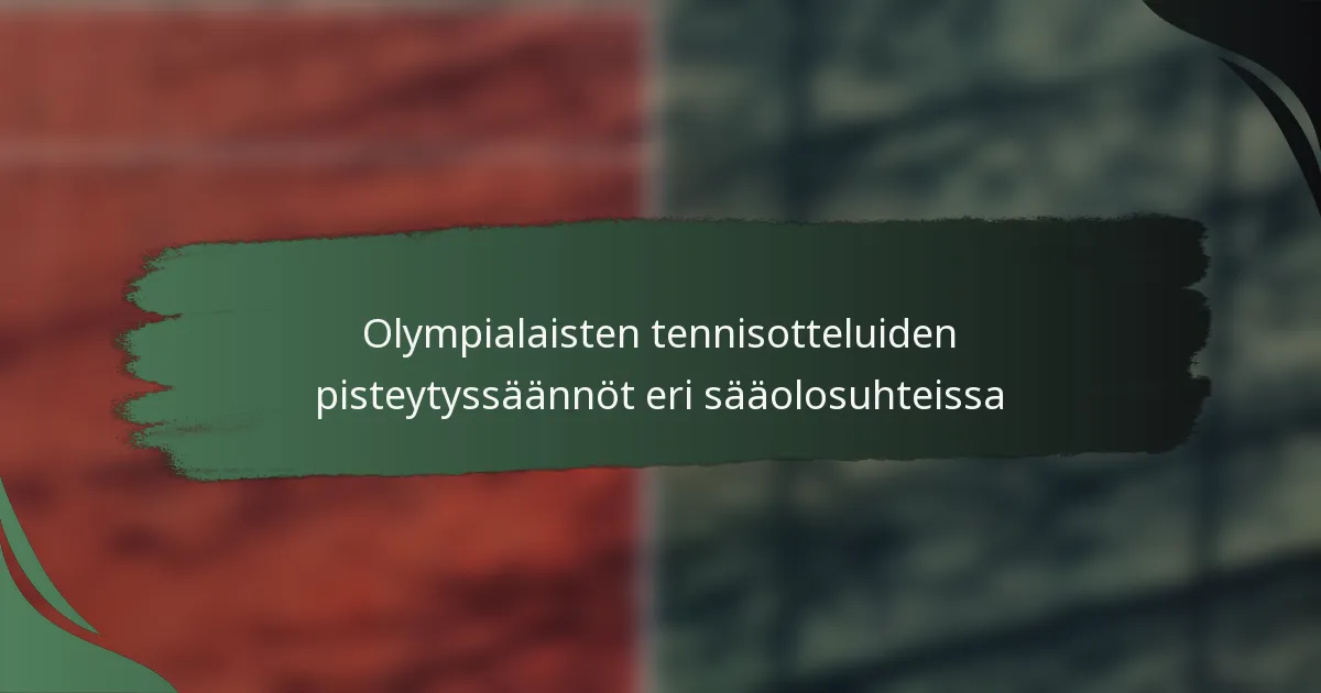 Olympialaisissa tenniksessä pisteytyssäännöt ovat samankaltaiset kuin perinteisessä tenniksessä, keskittyen pisteisiin, peleihin ja eriin voittajan määrittämiseksi. Kuitenkin sääolosuhteet, kuten sade, tuuli ja äärimmäinen kuumuus, voivat merkittävästi vaikuttaa pelaajien suorituksiin ja ottelun dynamiikkaan, mikä johtaa mahdollisiin muutoksiin pisteytyksessä ja pelistrategioissa.
